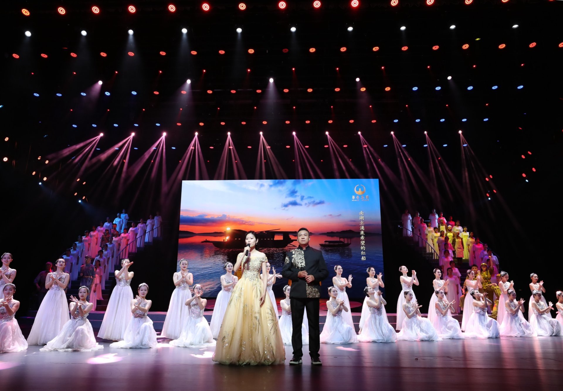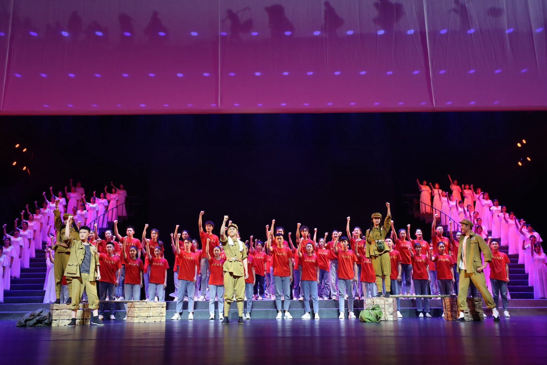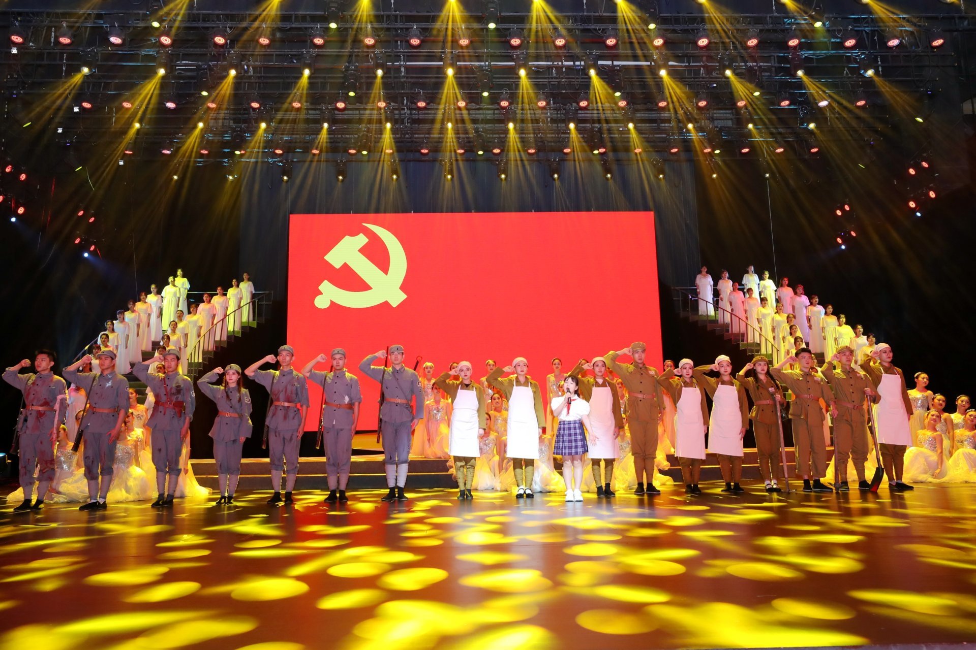 演出即將結束時,全體人員合唱《沒有共產黨就沒有新中國》,唱出了共產黨人奮進新時代、再創新輝煌的壯志豪情。在鏗鏘有力的旋律聲中,與會領導走上舞臺和演職人員合影留念。